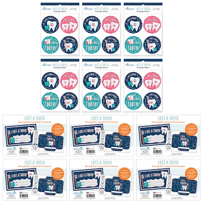 Barker Creek's new Lost A Tooth Classroom Set includes 90 Recognition Certificates, 90 templates to make necklace pendants and tooth-holding envelopes and 192 colorful Lost A Tooth Stickers/Self-Adhesive Badges. The award and cut-and-tape envelopes both have a space to write in students name and date. The awards and template sheets measure 8.5" wide by 5.5" high. The multicolored stickers measure 2.37" in diameter. Coordinating products available: Search Barker Creek Lost a Tooth.