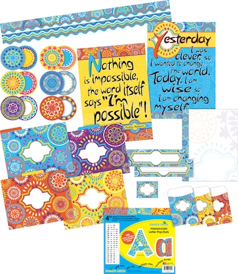 Barker Creek's Moroccan Designer Classroom Set is perfect to fill all your classroom decorating needs! Barker Creek bundled 9 of their bestselling products to bring you this Designer Classroom Set. Create beautiful bulletin boards with the posters, double-sided scalloped trim, double-sided accents, and letter pop-outs. The double-sided scalloped trim can also be used to frame your doors, accent displays and special projects, decorate your office cubicle, and jazz up your children’s rooms at home! Your next decorating project will "pop" with the colorful and classy 4" Moroccan letter pop-outs! There are two inspirational posters in this set. The first poster features a quote by Audrey Hepburn “Nothing is impossible, the word itself says “I’m possible.” The second poster is a quote by Rumi “Yesterday I was clever, so I wanted to change the world. Today, I am wise so I am changing myself.” Barker Creek's beautiful Moroccan Letter-Sized File Folders are an affordable way to organize your office, classroom, and home with style and flair. The double-sided name plates measure 12" L x 3.5" W and are incredibly versatile! These name tags measure 3.5" x 2.75" and can be used in a variety of ways! Use them as name badges, of course, and also keep them handy for labeling just about everything you want to keep track of! The multi design library pockets are great for organizing flash cards, hall passes, file folder game pieces, spelling word lists, library cards, reading logs, and more! The Computer Paper is affordable and beautiful. Use it to add a memorable touch to letters, design custom awards and certificates, or add an extra “WOW” to presentations and reports! There are endless ways to use this set, it is up to your imagination! Coordinating product available: Search Barker Creek Moroccan.