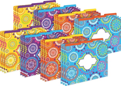 Barker Creek's Moroccan Letter-Size File Folders are an affordable way to organize your office, classroom, or home with style and flair. This set of stylish desk accessories includes 24 file folders - six each of four colorful designs. The folders are 1/3 tabbed, which means that they have three tab positions - eight folders are tabbed on the left, eight folders are tabbed in the center, and eight are tabbed on the right. The 14-point stock makes these folders perfect for desktop filing, meeting handouts, and student papers. These Moroccan file folders come with a preprinted "label" on the front for adding a table of contents, highlighting meeting agendas, listing the names of team members, bulleting travel itineraries, and so much more. These unique office supplies are fully reversible, each folder having a multicolored design on one side and a vibrant, solid color on the reverse side. The possibilities are limited only by your imagination! Coordinating products are available. Search: Barker Creek Moroccan.