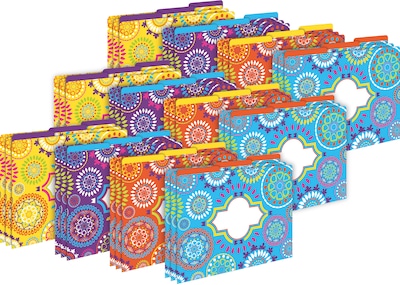 Barker Creek's Moroccan Letter-Size File Folders are an affordable way to organize your office, classroom, or home with style and flair. This set of stylish desk accessories includes 36 file folders - nine each of four colorful designs. The folders are 1/3 tabbed, which means that they have three tab positions - twelve folders are tabbed on the left, twelve folders are tabbed in the center, and twelve are tabbed on the right. The 14-point stock makes these folders perfect for desktop filing, meeting handouts, and student papers. These Moroccan file folders come with a preprinted "label" on the front for adding a table of contents, highlighting meeting agendas, listing the names of team members, bulleting travel itineraries, and so much more. These unique office supplies are fully reversible, each folder having a multicolored design on one side and a vibrant, solid color on the reverse side. The possibilities are limited only by your imagination! Coordinating products are available. Search: Barker Creek Moroccan.
