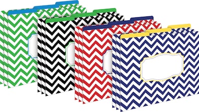 Barker Creek's Nautical Chevron Letter-Size File Folders are an affordable way to organize your office, classroom, or home with style and flair. This set of stylish desk accessories includes 12 file folders - three each of four colorful designs. The folders are 1/3 tabbed, which means that they have three tab positions - four folders are tabbed on the left, four folders are tabbed in the center, and four are tabbed on the right. The 14-point stock makes these folders perfect for desktop filing, meeting handouts, and student papers. These Nautical Chevron file folders come with a preprinted "label" on the front for adding a table of contents, highlighting meeting agendas, listing the names of team members, bulleting travel itineraries, and so much more. These unique office supplies are fully reversible, each folder having a multicolored design on one side and a soft, solid color on the reverse side. The possibilities are limited only by your imagination! Coordinating products are available. Search: Barker Creek Chevron.