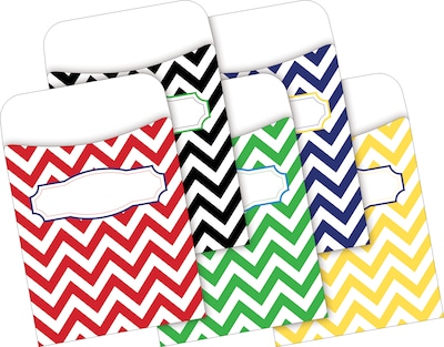 Barker Creek’s Nautical Chevron Peel and Stick Library Pockets are great for organizing flash cards, hall passes, file folder game pieces, spelling word lists, library cards, reading logs…and more! Each package includes 30 pockets -- six each of five chevron designs in Black, Green, Red, Navy, and Yellow. Each pocket has two self-adhesive peel & stick strips on the back making it easy to adhere them to file folders, binders, charts, signs, hallways, and doors. There is a pre-printed "label" on the front of each pocket for recording student names, listing contents, identifying hall passes, and writing book titles. These snazzy little pockets are a creative person's dream come true...the possibilities are limited only by your imagination! Coordinating products available: Search Barker Creek Chevron.
