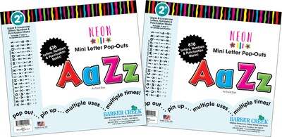 Barker Creek's Neon 2” Letter & Number Pop-Outs Combo Pack are sure to brighten up your next project with these versatile bulletin board numbers and letters. The 2" Letter Pop-Outs are perfect for smaller spaces where the 4" Letter Pop-Outs won’t fit. This set includes a well-researched assortment of 1352 upper and lowercase letters, numbers and punctuation marks. Spanish punctuation marks are also included. You'll find multiple uses for these die-cut letters. Super chic & easy to read, they’re perfect for your next project, presentation, report, poster or display. Use them to letter posters, create professional signs, make beautiful bulletin board displays, label presentation materials, make your Employee of the Month boards true eye-catchers, personalize your workspace and more! Coordinating products available: Search Barker Creek Neon.