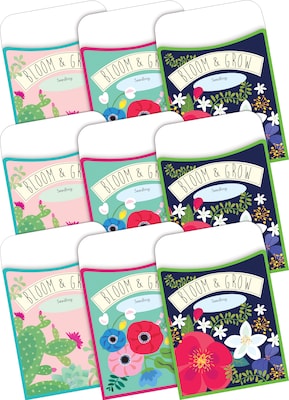 Barker Creek’s Petals & Prickles Peel & Stick Library Pockets are versatile and fun! Library Pockets are great for organizing flash cards, hall passes, file folder game pieces, spelling word lists, library cards, reading logs, and more! The package includes 90 pockets – thirty each of three colorful designs. The first design is navy that is bordered in green and features lovely pink, white, and purple flowers. The second design is an aqua color that is bordered in magenta and has beautiful flowers of various sizes and colors. The third design is light pink that has a turquoise border that has cacti and magenta flowers. Each pocket has two peel & stick strips on the back making them easy to adhere to file folders, binders, charts, signs, hallways, and doors. There is a blank space on the front of each pocket for recording student names, labeling contents, identifying hall passes, writing book titles – the possibilities are limited only by your imagination. Each library pocket measures 3 1/2" x 5 1/8" and will hold standard 3" x 5" Index Cards. Coordinating product available: Search Barker Creek Petals & Prickles.