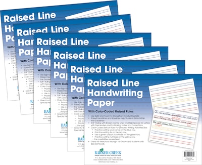 Barker Creek is very excited to introduce their new Raised Line Handwriting Paper with Color-Coded Raised Rules! You'll receive a total of 300 single-sided loose-leaf sheets of Raised Line Handwriting Paper and each sheet measures 8 ½” x 11”. Use sight and touch to strengthen handwriting skills. The raised headlines and baselines help students write within the guidelines. 5/8" ruling with broken center lines and skip spaces for letters with descenders and for making corrections. Color-Coded Sets of rules for directed writing activities like: Practice writing your name on the blue row; Practice writing As on the red row; Use a green crayon to write Bs on the green row and Practice writing numbers on the yellow row. Additional Writing Resources products available: Search Barker Creek Writing Resources.