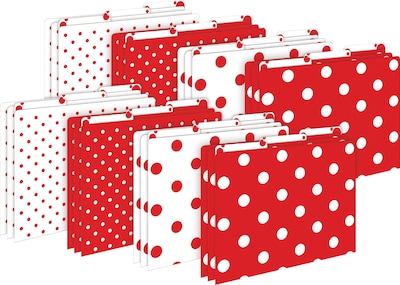 Barker Creek's Red & White Dot Letter-Size File Folders are an affordable way to organize your office, classroom, or home with style and flair. This set of stylish desk accessories includes 24 file folders - six each of four designs. The folders are 1/3 tabbed, which means that they have three tab positions - eight folders are tabbed on the left, eight folders are tabbed in the center, and eight are tabbed on the right. The 14-point stock makes these folders perfect for desktop filing, meeting handouts, and student papers. These unique office supplies are fully reversible, each folder having a red & white dot design on one side and a different dot design on the reverse side. The possibilities are limited only by your imagination!