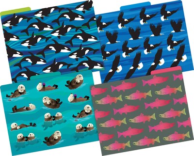 Barker Creek's Sea & Sky letter-sized file folders are an affordable way to organize your office, classroom, or home with style and flair! The set includes 12 folders - three each of four beautiful designs. These folders feature orca whales, playful otters, American bald eagles, and sockeye salmon! Coordinating designs are printed on the inside making each folder fully reversible for added value! The tabs are 1/3 cut and the folders are printed on durable 14-point stock. In addition to being great for everyday filing needs, these folders are also perfect for presenting meeting handouts, organizing important papers, sending work home with students, storing treasured photos and archiving other significant mementos. The possibilities are limited only by your imagination! See Barker Creek's full line of fashion-forward file folders!! Coordinating products available: Search Barker Creek Sea & Sky.