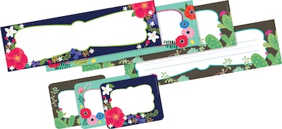 Barker Creek’s Petals & Prickles Name Tag & Name Plate Set is sure to add a pretty touch to every learning environment! Each set includes colorful floral designs. There are 45 self-adhesive labels – 15 each of 3 designs that measure 3.5" x 2.75" and 36 name plates – 12 each of 3 designs that measure 12" long x 3.5" wide. The brightly illustrated name tags are perfect for the first week of school, field trips, assemblies, special visitors, staff meetings and more! They can also be used to personalize file folders, binders, and notebooks. Use them as nameplates for your classroom library and to label learning center activities and supplies. The double-sided name plates are incredibly versatile! Use the side with rules when making name plates for student desks and lockers, creating word walls, making flashcards for spelling and vocabulary lists, and more. Use the side without the rules for making beautiful bulletin board signs, labeling cubbies, and making hall passes. Because they are double-sided, you can also hang them from the ceiling to identify learning centers, activity zones, library stacks. The uses are limited only by your imagination! Coordinating products available: Search Barker Creek Petals & Prickles.