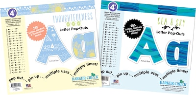 Barker Creek's Blue on Blue 4" Letter & Number Pop-Out Set are sure to brighten up your next project with these beautiful bulletin board numbers and letters. This two-pack set includes a well-researched assortment of 510 letters, numbers, and punctuation marks (including Spanish) -- 255 in the Thoughtfulness design and another 255 in the Sea & Sky design. Each design includes uppercase and lowercase letters, numbers and punctuation marks. You'll find multiple uses for these die-cut letters. Super chic & easy to read, they’re perfect for your next project, presentation, report, poster or display. Use them to letter posters, create professional signs, make beautiful bulletin board displays, label presentation materials, make your Employee of the Month boards true eye-catchers, personalize your workspace and more! Uppercase Letters and numbers are 4" tall, making the board letters easy to see from a few yards away. Short lowercase letters (like a and z) are 2" tall. Coordinating products available: Search Barker Creek Thoughtfulness and Barker Creek Sea & Sky.