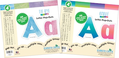 Barker Creek's Tie-Dye & Ombré 4" Letter and Number Pop-Out Set are sure to brighten up your next project with these beautiful bulletin board numbers and letters. This two-pack set includes a well-researched assortment of 510 letters, numbers, and punctuation marks (including Spanish) -- 255 in the Ombré design and another 255 in the Tie-Dye design. The ombré colors featured in this set are aqua/blue, lilac/purple, yellow/lime, and coral/pink. The tie-dye colors featured in this set are blue, purple, lime, and pink. Each design includes uppercase and lowercase letters, numbers and punctuation marks. You'll find multiple uses for these die-cut letters. Super chic & easy to read, they’re perfect for your next project, presentation, report, poster or display. Use them to letter posters, create professional signs, make beautiful bulletin board displays, label presentation materials, make your Employee of the Month boards true eye-catchers, personalize your workspace and more! Uppercase Letters and numbers are 4" tall, making the board letters easy to see from a few yards away. Short lowercase letters (like a and z) are 2" tall. Coordinating products available: Search Barker Creek Tie-Dye & Ombré.