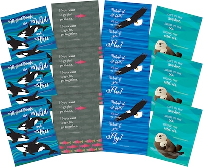 Barker Creek's What if You Fly Art Prints Set include twelve 8 x 10" art prints (three each of four prints). These art prints are perfect for the classroom, workplace or home! Frame them or hang them "as is"! The designs feature playful otters, beautiful bald eagles, magnificent orca whales, and colorful sockeye salmon. The bald eagle art print features the quote "What if I fall? Oh, but my darling, What if you Fly?" Erin Hanson. The quote on the otter art print says "Live in the sunshine, Swim in the sea, Drink the wild air." Ralph Waldo Emerson. The salmon art print features the quote "If you want to go fast, go alone. If you want to go far, go together." African Proverb. The quote on the orca whale art print says "All good Things are Wild and Free" Henry David Thoreau. Coordinating products available: Search Barker Creek Sea & Sky.