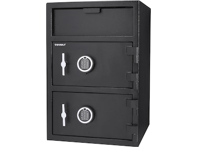 The 1.6/2 cu. ft. dual-compartment digital keypad depository safe by Barska is a heavy-walled steel deposit box intended for short-term storage of cash and is perfect for restaurants or any cash-business making regular bank deposits. The digital keypad can store up to one master PIN code and five user PIN codes. To resist tampering, this safe has a one-way deposit drawer with anti-fishing baffles that prevent deposited objects from being fished out, as well as a lockout mode that deactivates the keypad. A separate locker on the bottom of the safe is great for storing short-term valuables such as cash, coin, or important documents. Predrilled mounting holes on the bottom of this large deposit safe permits mounting with the included hardware.