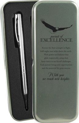 Baudville® "Pursuit of Excellence" Silver pen and pencil gift set is a memorable, functional gift to mark any occasion. It comes in a metal tin with message imprinted on the lid.