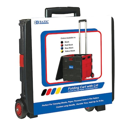 This 2-wheel plastic cart is foldable, so you can assemble it when you need to use it, and fold it down for storage. It has long handle that has few adjustable heights to match your height for comfort use. It is sturdy and can hold up to 70 lbs. Comes with a lid so you can protect your belonging from rain or wind; you can even pile more items on top of the lid to save a trip. Ideal for transporting books, documents, arts & crafts items and more! A great tool for teachers. Black and Red for a sporty feel and greater look.