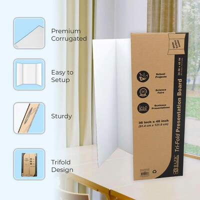 This self-standing tri-fold corrugated display poster board features pre-scored panels that fold out for instant setup and can be easily folded for storage and transport. It is rigid yet lightweight and portable, measuring a large 36 x 48 inches. The board is acid-free and has a thickness of 1/8 inch, constructed from a single wall with B-flute, providing a durable, beautifully finished, and professional look. This versatile board is perfect for school projects, science fairs, classroom presentations, booths, crafts, displays, promotions, scrapbooking, 3D crafts, birthdays, sporting events, and sale signs for retail stores. It is customizable and accepts a wide range of drawing media such as paint, chalk, markers, glue, tape, and glitter, serving as an eye-catching display board with a smooth and uniform finish. The blank display board allows you to create as you desire, making it great for a variety of crafts. Each pack includes 24 white presentation boards.
