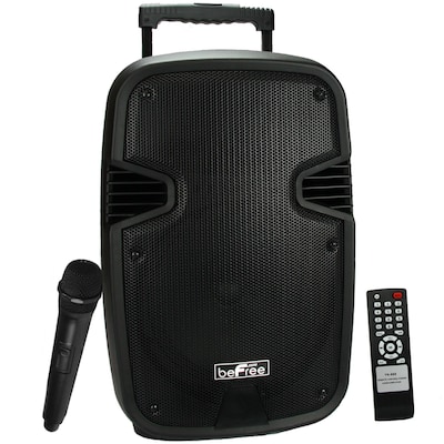 The beFree Bluetooth portable speaker with 10" subwoofer delivers rich quality sound that will keep your party going anywhere. Stream the music of your choice from Bluetooth-enabled devices. The included remote helps in controlling the music. The built-in wheel and handle ensures portability. Play the tune of your preference, as this speaker USB and SD compatible. The rechargeable battery offers 6 hrs of operation.