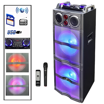 beFree Sound's Sound Double 10 Inch Subwoofer Bluetooth Portable Party Speaker is an all in one party companion! This Speaker not only delivers clear and extremely power sound, but provides a light show to go with it. Each of the large 10 inch Sub-woofers has built in reactive party lights which illuminate and liven up any scene. The unit features a top control panel with two large illuminated volume control nobs with a stunning blue halo light. Separate volume control for the included Microphone and the general speaker volume allow you to control the sound settings to perfection. Whether you will you this unit for public speaking, or social events, you simply can't go wrong. Features:BluetoothFM RadioSD InputUSB Input Built in Reactive Party Lights Two 10 Inch Sub-Woofers Line in L and Recharge / Charge Full Indicator Built in Side Handles Two 2.75" Tweeters2.5" Illuminated Mic Volume Nob2.5" illuminated Volume Nondigital Setting Display Two Top Handles 8.5" x 2" for easy transport Can be rolled in front of behind Treble, Bass and Echo control nobsMic Input Guitar InputAC 100-240v50/60HzIncludes Remote Control: Requires 2 x AAA Batteries (Batteries not included)Includes Wireless Microphone : Requires 2 AA Batteries (Batteries not included)Separate Light ON/OFF Switch14" Extendable Antenna Item Dimensions: 35.4" x 12.6" x 11.5"Item Weight: 31 LB