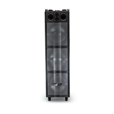 beFree Sound's Triple 10" Subwoofer Portable Bluetooth Speaker with Party Lights is the ideal all in one party companion! This Speaker not only delivers clear and extremely powerful sound, but also provides a stunning light show all night. Each of the three large 10" Sub-woofers has built in reactive party lights which illuminate and liven up any rave. The unit features a top control panel with two large lit up volume control nobs each featuring a stunning blue halo light. Separate volume control for the included Microphone and the general speaker volume allow you to control the sound settings to perfection. You can even use the remote to change tracks and adjust everything from input to volume from across the room.