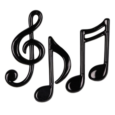 Beistle Molded plastic musical notes in black color promote fun and also help to make the event memorable. Musical notes have size ranging from 4 1/4" - 5 1/2" and provide a 3D effect for added elegance, sold as 12 per pack.