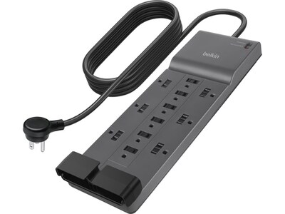Perfect for home or office, this 12 AC outlet surge protector with 8' cord keeps your electronics and appliances safe via 3940 joules of surge protection. Take advantage of extra room to conveniently plug in larger connectors, a slim profile that saves space, and enjoy peace of mind.