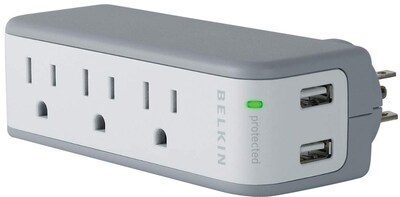 Keep your mobile devices charged and protected when you're on the road with the Belkin SurgePlus 3-Outlet Mini Travel Surge Protector. Plug this USB travel charger into any wall outlet and power up to three AC devices at once without extra cords. The 360-degree swivel feature makes it easy to fit this SurgePlus in small spaces. The Belkin SurgePlus 3-Outlet Mini Travel Surge Protector adds outlets and peace of mind when you're away from home. Plug it into any wall outlet for three additional outlets without extra cords. Two powered USB ports (2.1A combined) offer convenient one-source charging for your mobile devices, including tablets. The SurgePlus Travel USB Swivel Charger offers a high level of protection with its 918-Joule energy rating. Oversized Metal Oxide Varistors (MOVs) absorb excess electricity for additional protection, while damage-resistant housing protects circuits from fire, impact, and rust, and prevents dents and scratches. Your devices will be safe from damage, data loss, file corruption, and system crashes that may occur due to electrical surges.