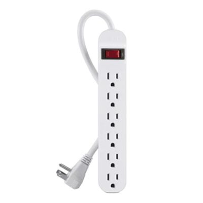 The Belkin F9P609-05R-DP 6-outlet power strip in white, has space saving design that plugs into any wall outlet and heavy duty 5' power cord. It provides single-source powering of cellphone chargers, radios, laptops and other home essentials.