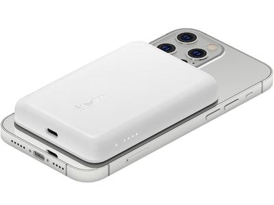 The Belkin BOOST CHARGE wireless charging power bank that takes full advantage of MagSafe technology and won't block the iPhone 12's camera, so you can keep using your phone while it charges. Perfect for travel or commuting, this slim and portable charger provides a quick power boost anywhere you go. An LED light lets you know when the power bank needs recharging, and pass-through charging lets you keep charging your phone at the same time.