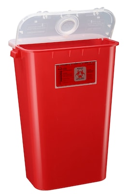 Bemis 11-Gallon large sharps container #111030 - red, box of 6. Separate round opening accepts small items. Molded-in handles for easy lifting and transport. Hinged lid accommodates large items. Compact design uses minimum floor space. Large opening lids accommodate a variety of sharps. Lids provide temporary and final closure. Nestable to save space and reduce shipping costs. Molded-in handles for easy lifting and transport. Multilingual labeling ensures user safety. Dimensions: 22 1/2" H x 16 1/2" L x 11 13/16" W.