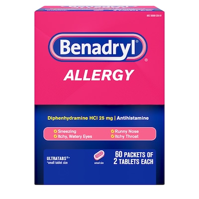 - Each box contains 60 packets of 2 tablets of Benadryl Ultratabs Antihistamine Allergy Relief Tablet Go Packs provide convenient on-the-go allergy & cold relief that works when you need it most. Great for travel or the break room!