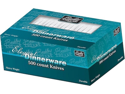 Keep your lunch room well-stocked with this box of 500 disposable knives. These Berkley Square Elegant Dinnerware knives are great to have on hand for any casual occasion, from an office potluck to a holiday party. The box is reclosable to keep unused knives sanitary, and the heavy-duty polystyrene material is durable and disposable.