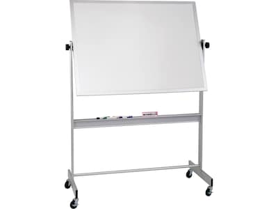 Write notes and pin up project materials using this two-sided easel with a dry-erase board on one side and a natural cork board on the other. The 360-degree pivot hinge lets you flip the board without turning the entire frame around, and the 3-inch locking casters offer mobility. Store supplies on the integrated marker rail for quick access. This Best-Rite presentation easel has a silver aluminum frame for added stability.