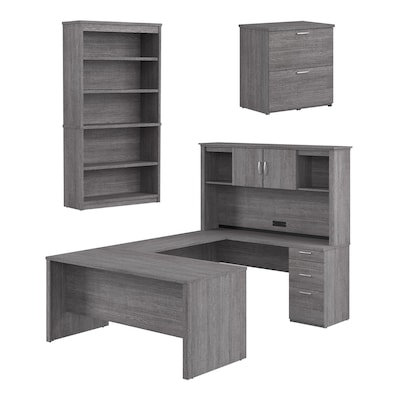 Bestar Logan 66"W U or L Shaped Desk with Hutch, File Cabinet, and Bookcase, Bark Grey (46851-47)