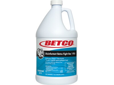 The Betco Fight Bac RTU disinfectant liquid for use in hospitals, nursing homes, schools, and hotels is a great quaternary-based, antibacterial cleaner. It provides excellent performance in cutting grease, heavy soil, and filth with quick drying times. The disinfectant is efficacious against COVID-19, TB, staph aureus, salmonella, pseudomonas, and E. coli. It's also virucidal when used on precleaned environmental surfaces against HIV-1 (AIDS virus) and canine parvovirus.