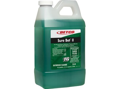 Betco Sure Bet II disinfects, cleans, and deodorizes in one labor-saving step. This formulation penetrates and dissolves soap scum, ground-in dirt and grime, mineral deposits, rust, lime soap buildup, hard water stains, and kills household germs. Cleans and shines without abrasive scouring action. Deodorizes too, leaving your bathroom smelling fresh.