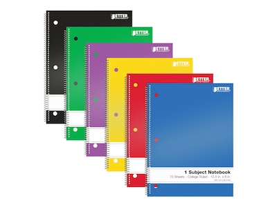 Whether you need notebooks for school, home, or office use, Better Office offers quality products at superb value. These spiral-bound notebooks come in six solid colors: black, blue, red, yellow, green, and purple (four of each color). Sturdy paperboard front and back covers protect your notes and provide a sturdy surface when fixed surfaces aren't handy. The notebooks are three-hole punched to fit a standard-size three-ring binder with a snag-free coil binding. The sheets feature college ruling in blue and are perforated along the left margin for easy removal.