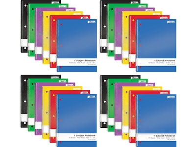 Whether you need notebooks for school, home, or office use, Better Office offers quality products at superb value. These spiral-bound notebooks come in six solid colors: black, blue, red, yellow, green, and purple (four of each color). Sturdy paperboard front and back covers protect your notes and provide a sturdy surface when fixed surfaces aren't handy. The notebooks are three-hole punched to fit a standard-size three-ring binder with a snag-free coil binding. The sheets feature wide ruling in blue and are perforated along the left margin for easy removal.