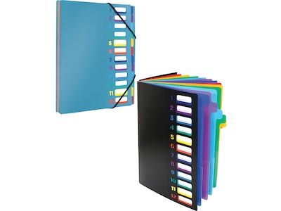 These Better Office 24-pocket expanding file folder organizers are made of durable PP plastic in black and blue, with tabs in six assorted colors. Each colored tab has two clear pockets. Durable covers are numbered from one to 12 and include removable paper inserts that can be customized and reinserted.