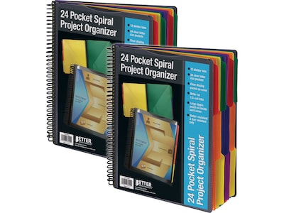 This Better Office 24-pocket poly project organizer has 12 1/3-cut divider tabs made of thick poly, with clear diagonal-cut pockets on both sides of each divider. It features a 1"Dia. heavy-duty spiral, so the pockets can be filled to their maximum capacity. Write directly on the tabs with a permanent marking pen. Remove marks with rubbing alcohol and a clean paper towel. Two tabs in each of the six featured colors allow for color-coding and organizing your projects and files. A clear window pocket on the front cover fits an 8.5" x 11" cover sheet, and a roomy 11" x 7" clear zipper pouch on the inside back cover provides convenient storage for incidentals and other sundries.