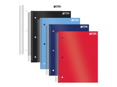 Whether you need notebooks for school, home, or office use, Better Office offers quality products at superb value. These spiral-bound five-subject college-ruled notebooks feature water-and stain-resistant poly covers in five assorted solid colors. The covers protect your notes and provide a sturdy surface when fixed surfaces aren't handy. Each notebook is three-hole punched to fit a standard-size three-ring binder with a snag-free coil binding. Each 200-sheet notebook has four two-sided heavy-duty pocket dividers to hold loose papers and provide a convenient separation of the notebook into five sections of 40 pages each. The sheets feature college ruling in blue and are perforated along the left margin for easy removal.
