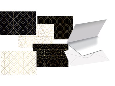Better Office bulk all-occasion greeting card pack including 100 cards featuring six geometric cover designs in gold foil, three with black backgrounds, three with white backgrounds; complete with 100 white envelopes. Cards are made of 90 lb. cover stock for a high-quality look and feel.