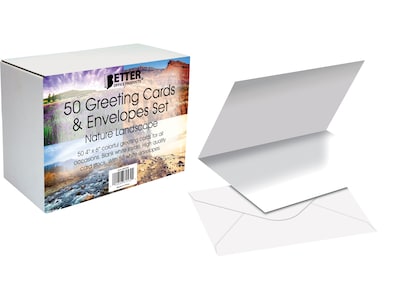 Better Office bulk all-occasion greeting card pack including 50 cards featuring six beautiful printed photographs of natural landscapes; complete with 50 white envelopes. Cards are made of 90 lb. cover stock for a high-quality look and feel.