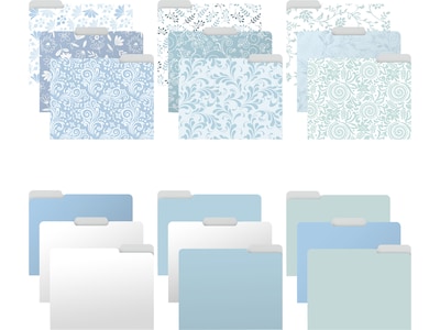 The Better Office 18-pack of gorgeous decorative file folders comes with nine Floral & Paisley designs that are complemented by nine matching solid-color folders for a fun mix-and-match variety pack. Made of heavyweight (300gsm) paper with a laminated finish for added durability and sheen. The 1/3-cut tabs allow a sizable amount of space for customization. Use these folders in the office or at home to brighten your workspace and personalize your project folders.