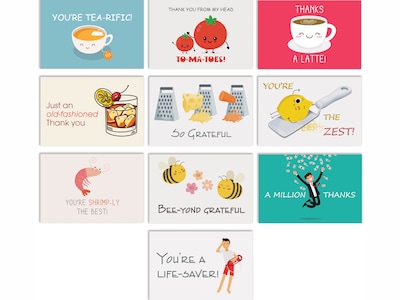 This Better Office Funny Pun bulk pack of thank-you cards set features cute and funny puns. The set features 10 cover designs and includes 50 cards and 50 white envelopes. The cards are made of 90 lbs. cover stock for a high-quality look and feel. The envelopes are 32 lbs. white offset paper. The unique designs with funny expressions are perfect for people who like silly humor.