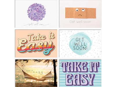 - Cards come in six designs denoting Get Well Soon/Take It Easy wishes