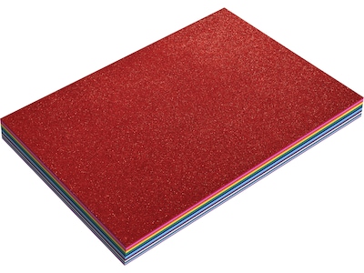 The Better Office extra-large 12" x 17.5" glitter foam sheets come in 20 popular crafting colors. One 12" x 17.5" sheet of each red, fuchsia, pink, orange, yellow/gold, champagne, green, lime green, dark blue, royal blue, light blue, ice blue, purple, silver, black, and white, with two-tone colors including royal blue/gold, pastel pink/pastel blue, and red/gold. The glitter coverage is thick and evenly applied to the foam to give your crafts a sparkly touch that will last.
