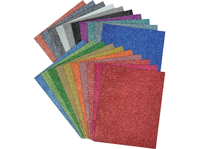 The Better Office adhesive-backed 9" x 12" glitter foam sheets come with 20 popular crafting colors including red, fuchsia, pink, orange, yellow/gold, champagne, green, lime green, dark blue, royal blue, light blue, ice blue, purple, silver, black, white, and two-tone colors of royal blue/gold, pastel pink/pastel blue, and red/gold. The glitter coverage is thick and evenly applied to the foam to give your crafts a sparkly touch that will last.