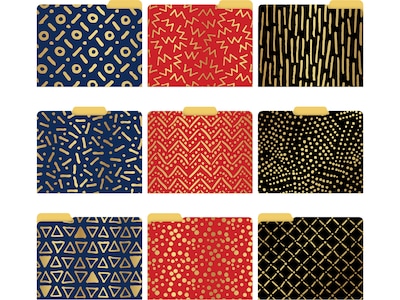 - Features two identical sets of nine distinct folder designs: three bold colors (red, blue, and black), each with three geometric gold-tone foil designs