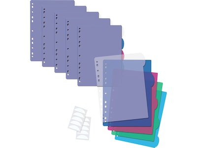 The Better Office five-tab poly index dividers are handy when you need to organize and catalog papers, documents, and other collectibles in a three-ring binder. Use the white adhesive labels (included), or write directly on the tabs with a permanent marking pen to customize. Each of the five sheets is a different color (clear, blue, fuchsia, lime, teal) with a matching tab, which is great for color-coding your files. Suitable for school, office, or home.