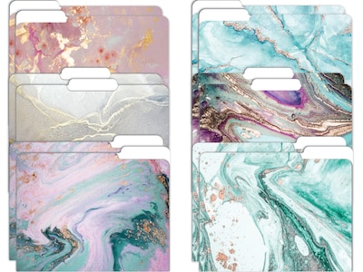 The Better Office Marbled fashion file folders come in six unique colorful pattern designs printed on heavyweight (300 gsm) paper with a clear-coated finish for added durability and sheen. The 1/3-cut tabs allow a sizable amount of space for customization. Use in the office or at home to brighten your workspace and personalize your project folders.