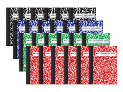 The Better Office mini composition books are great for those who prefer a traditional bound memo book with a sturdy paperboard cover for note-taking, jotting down reminders, or journaling. These tape-bound mini composition books come in four colors (red, blue, black, and green), six of each color. The sturdy paperboard front and back covers protect your notes and provide a sturdy surface when fixed surfaces aren't handy. The sheets feature narrow spacing in blue to keep your writing in alignment line after line. Small enough to comfortably fit in a pants pocket, jacket pocket, or purse. Matches sturdiness of standard-size composition books.